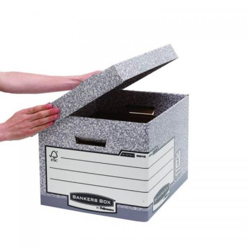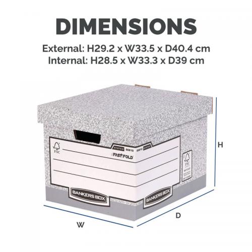 1. This Bankers Box standard storage box features time saving Fastfold assembly and and oversized lid, which can accommodate A4 and foolscap suspension files, ring binders, lever arch files and Bankers Box 120mm transfer files. This pack contains 10 grey storage boxes measuring W333 x D380 x H285mm (internal) .