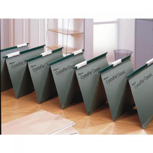 1. The Crystalfile Classic Linked Suspension File is a concertina-style linked manilla suspension file. This design saves space and prevents documents being mis-filed. The top tabs and inserts provide labelling space on the top and front of the file. Inserts are printable; supplied in a box of 50.