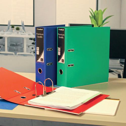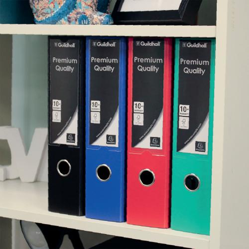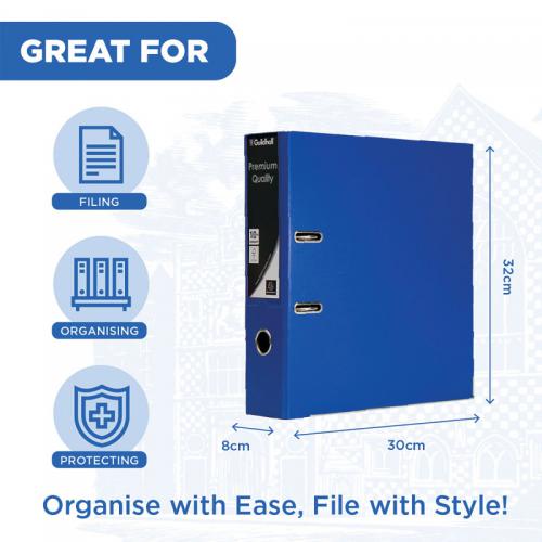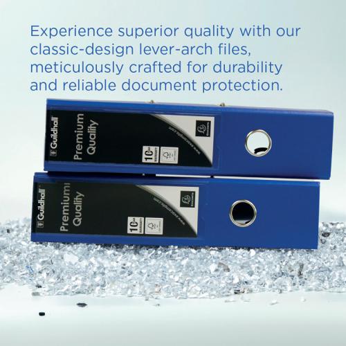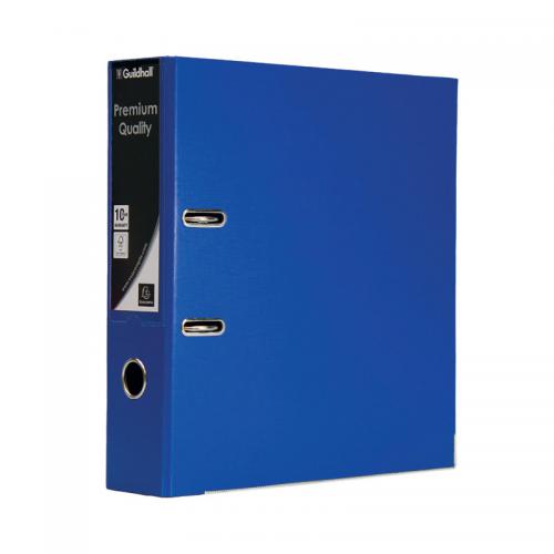 1. This durable Guildhall A4 polypropylene over board lever arch file features a 80mm filing capacity for up to 650 sheets of paper, large spine label for easy identification of contents and a finger hole for easy retrieval from a shelf. Ideal for implementing a colour coordinated filing system at home or in the office, this pack contains 10 blue lever arch files.