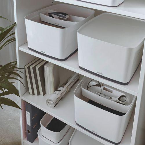 1. The Leitz MyBox modular storage system lends an unique style to your home or office. The storage box is sturdy and made of premium quality material in a high gloss finish with a dual colour effect. For quick, easy and attractive storage of A4 documents, magazines and various accessories. The modular system allows for optimal content management solutions. Complements dual colour products from the Leitz WOW range.