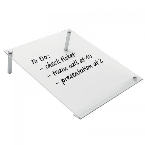 1. This home office A4 whiteboard angled notepad with a modern frameless contemporary design is perfect for making notes, capturing thoughts, ideas or key dates. The clear, acrylic mini whiteboard notepad is angled using stylish through mounts to give the optimal writing position. It fits neatly onto any desk or worksurface and with the transparent design, the memo board blends seamlessly into the background when not in use. The transparent, acrylic dry erase surface can easily be wiped clean to simply write, wipe away and start afresh. Supplied with a whiteboard pen.