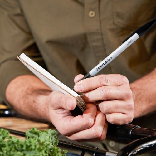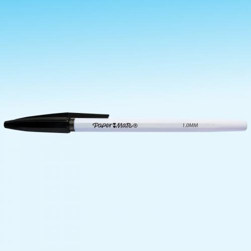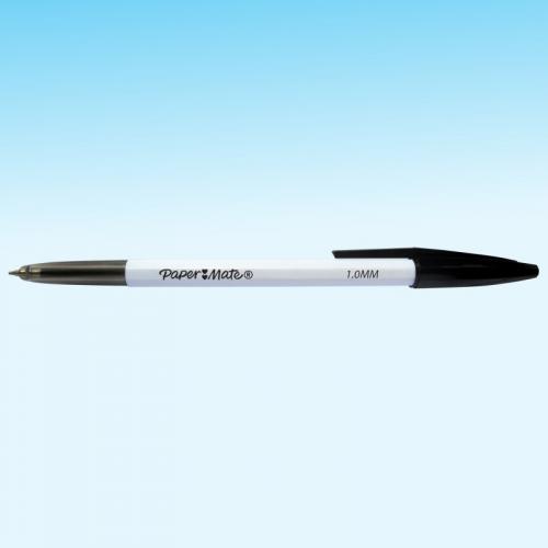 1. Experience laser-smooth writing with Paper Mate Ballpoint Pens. These black pens feature laser tip technology for a fluid and accurate writing experience. The 1mm fine point lays down bold details so your writing stands out. Each Paper Mate pen has a slim, lightweight design and a cap colour that matches the body for easy identification. Supplied in a pack of 50 black ballpoint pens.