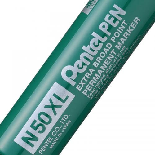 1. The new Pentel N50XL Green is a new addition to the N50 Family permanent marker. This Robust permanent marker will write on almost any surface including wet and oily surfaces. Maximum performance you can rely on every day. Strong aluminium barrel, perfect for long lasting in more harsh working environments! Durable tips, suitable for rough or smooth surfaces. The N50XL has a broad chisel tip and creates variable line widths of up to 17mm