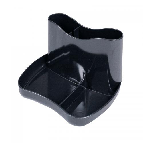 1. This Q-Connect Executive Desk Tidy features 4 compartments for pens, pencils, scissors, sticky notes, paperclips, pins, staples, erasers and more. Ideal for desktop storage and organisation, this black desk tidy measures W150 x D120 x H93mm.