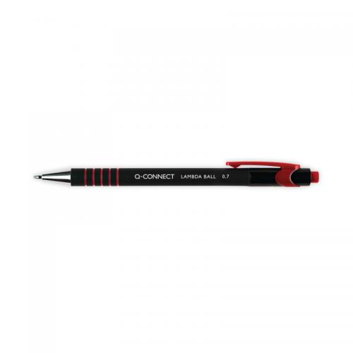 1. This Q-Connect Lamda Retractable Ballpoint Pen has a strong metal tip for a crisp medium 0.4mm line width with quick-drying black ink. The full-length soft rubber barrel provides comfort and the sturdy pocket clip allows you to fix your pen to documents or clothing with security and without difficulty. This pack contains 12 red pens.