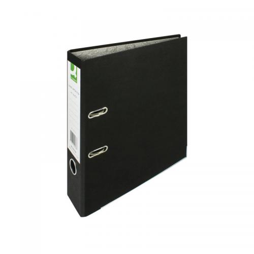 1. Manufactured using recycled board and paper, these Q-Connect Lever Arch files have a 70mm capacity for A4 documents. The file features a large labelling area on the spine for quick identification of contents, a thumb hole for easy retrieval from the shelf and locking slots and metal shoes for durability. This pack contains 10 black files.