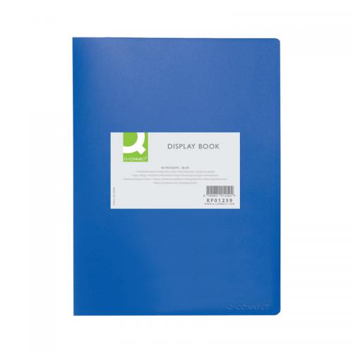 1. This quality Q-Connect polypropylene display book is perfect for filing, displays and presentations. The 40 clear, copy safe pockets protect and display up to 80 A4 sheets for a professional finish. This pack contains 1 blue A4 display book.