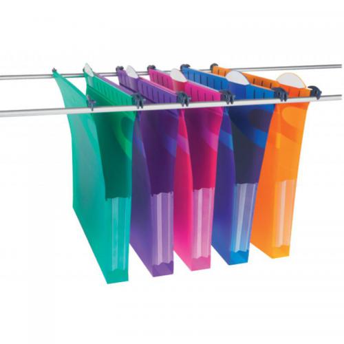 1. Rexel Multifile Extra Secura Suspension Files are made from premium polypropylene in bright, semi-translucent colours, with a wipe clean satin finish for a vibrant look and feel. Features protective polypropylene side walls to prevent document slipping, plus unique linkable, colour-coded bars and repositionable tabs and inserts providing quick access to important files. Pack of 10 vibrant colours 2 x blue, 2 x pink, 2 x purple, 2 x green and 2 x orange, ideal for creating a colour coded filing system in filing cabinets, desk drawer chassis and desk top organisers with rails 330mm apart. This foolscap mis-range capacity hanging file has a 30mm square base, which holds up to 300 A4 sheets (80 gsm). The file dimensions are 387 x 240mm, runner length 407mm to allows for easy access to frequently used documents. Available in A4 or Foolscap size option.