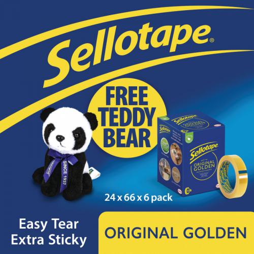 1. Ideal for everyday use, this Sellotape Original Golden Tape provides excellent adhesion and outstanding control. An easy tear roll lets you cleanly break off a piece of tape, without the need for scissors. This non-static, clear tape will bond paper, card and other materials quickly and efficiently. This pack contains 6 large core rolls of tape measuring 24mm x 66m. Receive a FREE Sellotape Panda Bear withery 6 pack of 24mm x 66m Original Golden Sellotape.