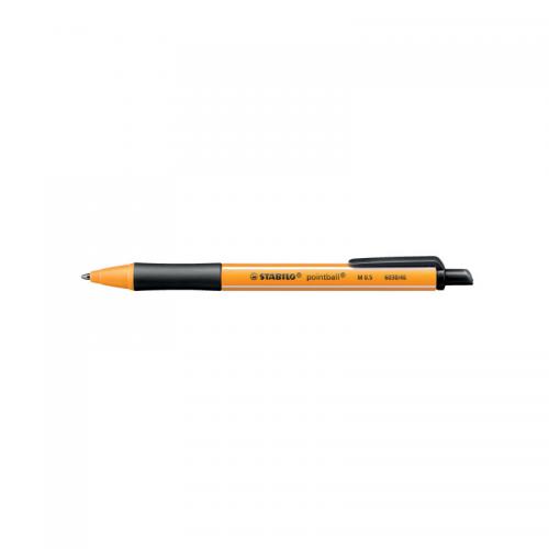 1. The Stabilo Pointball is a refillable and retractable ballpoint pen in the style of Stabilo point 88 with its orange and white stripes. The pen is manufactured from 79% recycled plastic and it is recyclable after use. The blue, black and green ink is document proof. Its non-slip grip zone helps fast and relaxed handwriting with a click mechanism that will not let you down. The pen has a medium tip with a line width of 0.5mm. The Stabilo pointball with long lasting, fast drying vivid ink colours is the ideal pen for school or office and a must have for any pencil case.