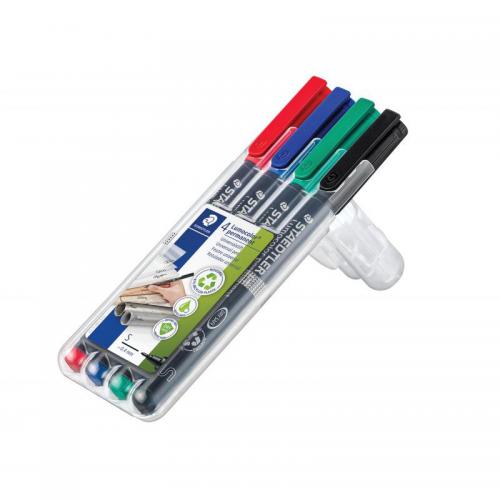 1. This premium Staedtler Lumocolour pen has been specially developed for use on overhead projection film for high intensity, vibrantly coloured presentations. This versatile pen is also suitable for use on a variety of other surfaces including glass, CDs, plastic, porcelain, wood and leather. The water-soluble ink is fast drying to avoid smudging, but can be easily wiped from film after use using a damp cloth. The fine 0.6mm tip is great for neat, legible writing, drawing, diagrams and more. This pack contains 4 assorted pens in Black, Blue, Green and Red.