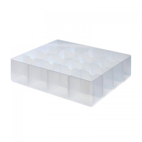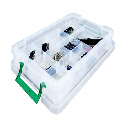 1. This handy large tray fits StoreStack 24 litre boxes (2 trays per box) and 36 litre boxes (3 trays per box), and features fixed plastic dividers, which create 16 compartments for customisable use. Ideal for organising stationery, tools, and other small items, this pack contains 1 large, clear tray. (Box not Included).