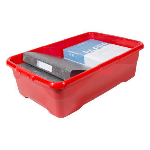 1. The 30 litre plastic curve box is part of a range of boxes designed to give great general storage solutions. They come in three handy sizes, 30L, 42L and 65L. Available in three colours, red, blue and clear. Lids are also available on all of the boxes and these are sold separately. A great value storage solution.